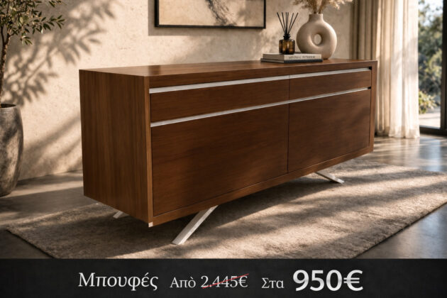 Κομψός μπουφές από καρυδιά με μοντέρνο σχεδιασμό και πρακτικούς αποθηκευτικούς χώρους. Εκθεσιακό κομμάτι υψηλής αισθητικής σε προνομιακή τιμή.