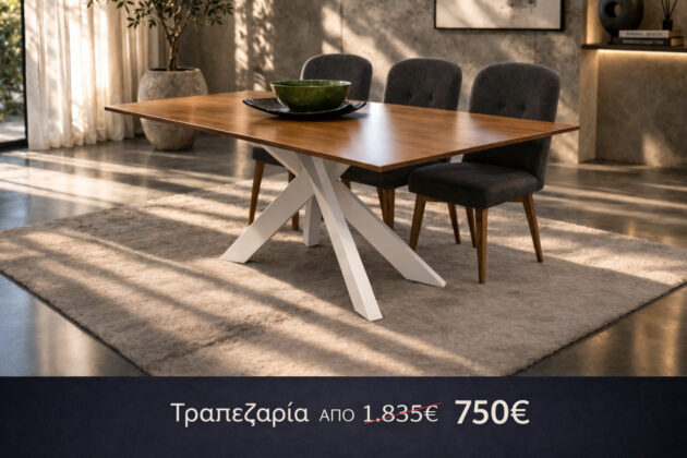 Εντυπωσιακή τραπεζαρία, συνδυασμός καπλαμάς καρυδιάς & λάκας με μοντέρνα γεωμετρική βάση και κομψό design. Εκθεσιακό κομμάτι υψηλής αισθητικής διαθέσιμο σε προνομιακή τιμή.